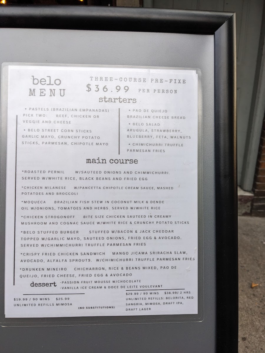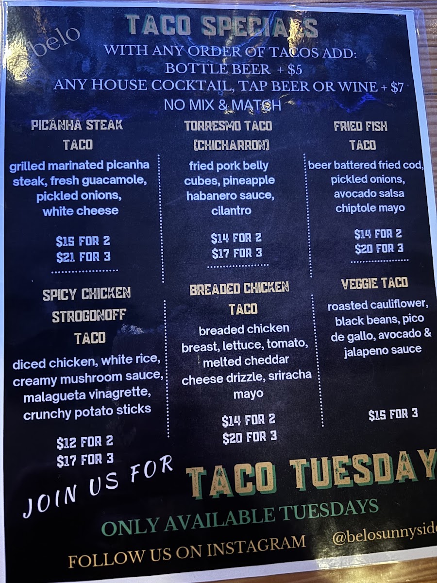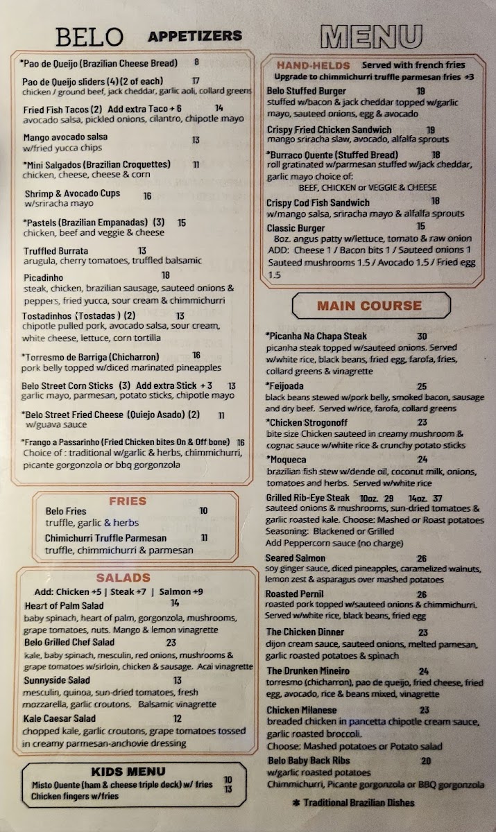 The drink offerings complement the food with creative non-alcoholic options like a creamy Virgin Colada or a bright, minty Nojito, both fitting seamlessly with the venue’s lively yet welcoming atmosphere. Whether stopping by for a relaxed morning meal, a casual lunch, or an evening of simple pleasures, the menu reflects the easygoing spirit of the neighborhood and the inviting vibe of Belo itself.